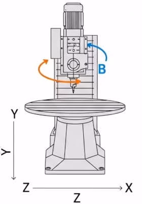 A 5-axis machine combines three linear axes with two rotary axes. Depending on the machine concept, either the workpiece (e.g., via a swivel rotary table) or the tool (e.g., via a swivel head or trunnion head) is moved.